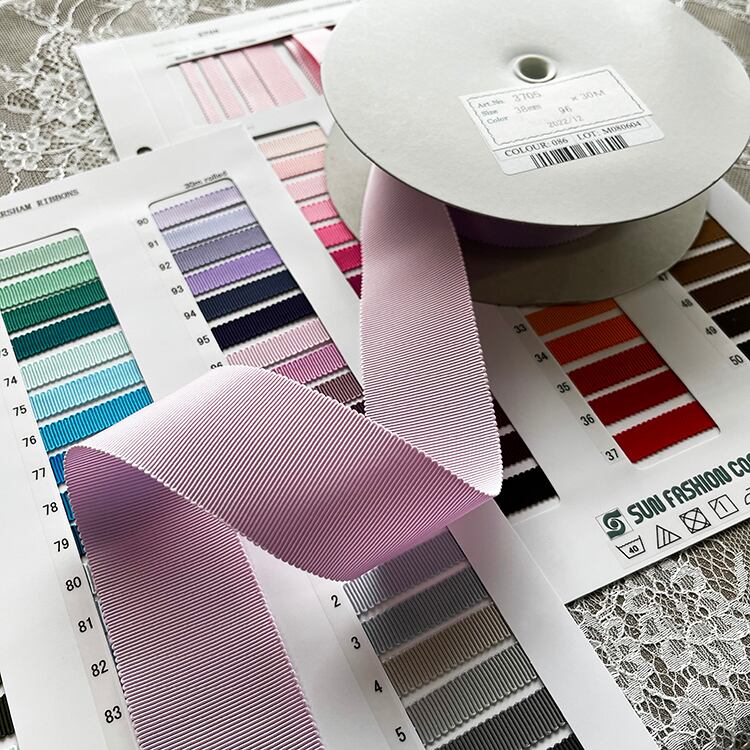 "発色が良いポリエステルのペタシャムリボンです。全100色、11サイズの豊富なバリエーション展開があります。程よい肉厚感があるので、リボンを使った作品作りにも最適です。仕立:30m/巻